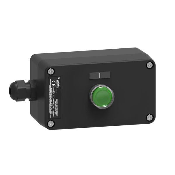 Kunststoff-Steuergehäuse - 1 S - grün - Start. Es gehört zur Baureihe Harmony XAW ATEX D komplette Metall- oder Kunststoffgehäuse für explosionsgefährdete Bereiche.