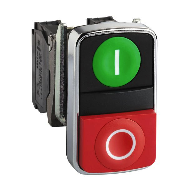 | Kurzbeschreibung | Doppeldrucktaster, Frontelement, Harmony XB4, Metall, 22mm, grün, rot, beschriftet I/O, tastend |