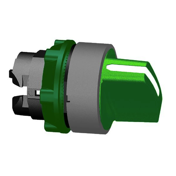 Wahlschalter aus Kunststoff als Frontelement und 22mm Einbaumaß, Baureihe Harmony XB5. Farbe des Wahlschalters ist grün. Der Betätiger hat 2 Stellungen. Die Farbe des Außenrings ist grau. Die modularen Harmony Baureihen mit 22mm Einbaumaß kombinieren einfache Installation, Effizienz, modernes Design, Flexibilität mit höchster Robustheit. IP-Schutzklassen bis IP69K und Umgebungstemperaturen von -40°C bis +70°C. Produktstandards gem. EN/IEC 60947-5-1, EN/IEC 60947-5-4, CSA C22.2 No 14, UL 508, EN/IEC 60947-1, JIS C 4520. Zertifizierungen nach DNV, GL, UL gelistet, RINA, BV, CSA, LROS (Lloyds register of shipping). Produktstandards gem. EN/IEC 60947-5-1, EN/IEC 60947-5-4, CSA C22.2 No 14, UL 508, EN/IEC 60947-1, JIS C 4520.