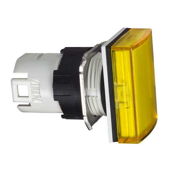 Rechteckiger Gelber Leuchtmelder-Frontelement für integrierte LED. Es ist Teil der Baureihe Harmony XB6 mit einem Durchmesser von 16 mm, kompakte Kunststoffdrucktaster, Schalter und Leuchtmelder.