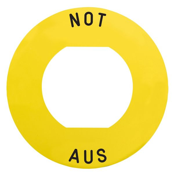 Schild für Not-Aus-Taster. Durchmesser des Schildes 60mm. Farbe gelb. Kompatibel mit der Verwendung des Schutzkragens wie z.B. ZBZ1605. Beschriftung NOT AUS.