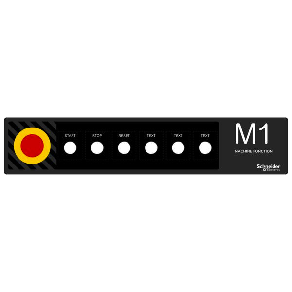 Beschriftungsfeld/Legendenfeld zum Aufkleben hinter die Befehls- und Meldegeräte wie z.B. Drucktaster, Leuchtmelder, Wahlschalter aber auch HMIs oder weitere Steuergeräte. Größe 500x100mm. Das Beschriftunsgfeld hat eine bereits vorgefertigte Beschriftung bzw. Layout. Mit der Kombination des Beschriftungsfeldes und den modernen Befehls- und Meldegeräten der Baureihe Harmony sorgt man für einen attraktiven, neuen Stil.