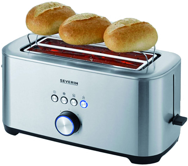 7 variabel einstellbaren Bräunungsstufen, geeignet für 4 XXL-Toasts, integrierter Brötchen-Röstaufsatz, integrierte Bagel-Funktion (einseitiges Toasten), Aufwärm-, Defroster- und Auslösetaste mit Kontrollleuchte, Krümelschublade, automatische Abschaltung bei Verklemmen einer Brotscheibe, Gehäuse in Voll-Edelstahldesign