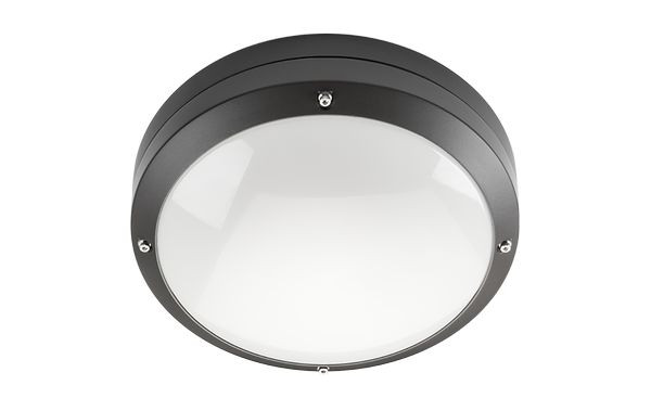 Schöne runde Leuchte, die sowohl in Außen- als auch in Innenbereichen an Wänden und Decken montiert werden kann. Aus pulverbeschichtetem Druckguss-Aluminium. Flache Abschirmung aus UV-stabilisiertem Opal-Polycarbonat.