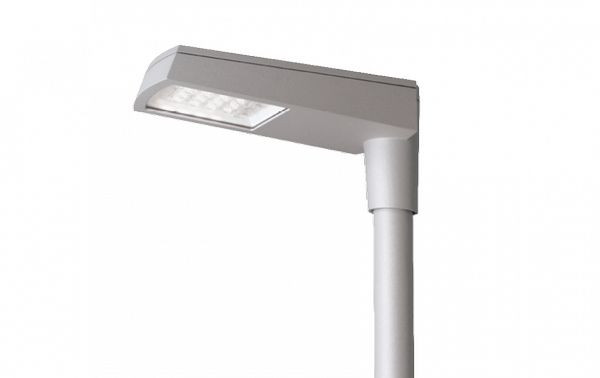 LED-Mastleuchte, IP66. Gehäuse aus Druckgussaluminium, Front aus gehärtetem Glas. Basis und obere Abdeckung in texturiertem Hellgrau. Direkt-asymmetrische Lichtverteilung (Multilens). Zur Montage an 60 mm Mast vorbereitet und mit 6 m Anschlusskabel vormontiert.Design: Christian Hvidt