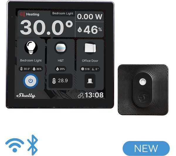 Steuere Deine smarten Geräte mit dem Shelly Wall Display von einem zentralen Ort aus, jetzt in Kombination mit dem Shelly BLU H&T für eine präzise Klimasteuerung - Integriertes 5-A-Relais zur Gerätesteuerung Neutralleiter erforderlich - Überwachung des Eigenverbrauchs aller Geräte im von Dir gewählten Raum - Kann zusammen mit dem Shelly BLU H&T - einem Bluetooth-Temperatur- und Luftfeuchtigkeitssensor für sofortige Umweltdaten - als - Raumthermostat fungieren - Farbiges Display Einfache Navigation, anpassbarer Homescreen und einstellbare Helligkeit Erstellen von Szenen und Zeitplänen
