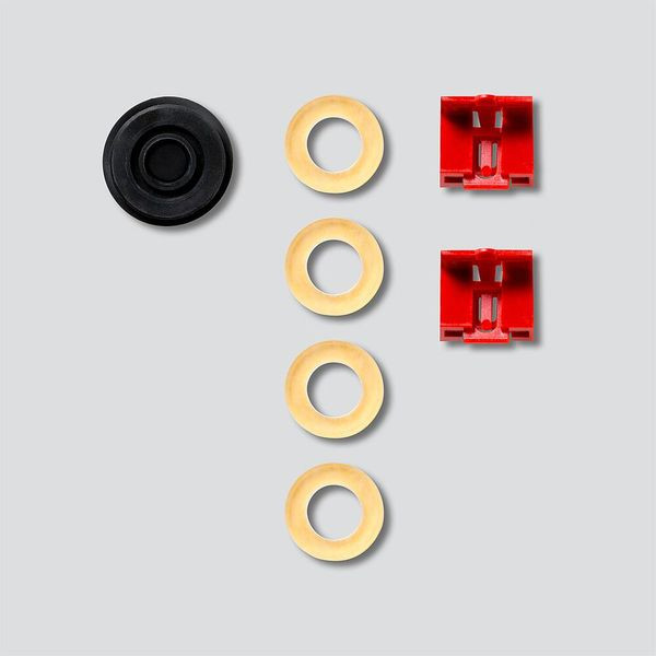 Zubehör Aufputzgehäuse, bestehend aus 4 Distanzscheiben, Gummimebran für die Kabeleinführung sowie 2 Rastnasen für die Befestigung des Montagerahmen.