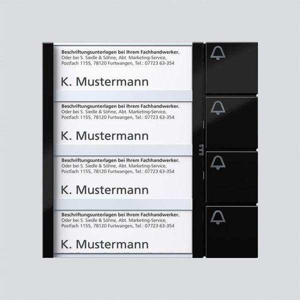 Tasten-Modul mit Namensschildtasche, 4 Namensschildern und 4 separaten Ruftasten mit Glockensymbol.
