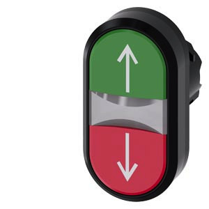 beleuchteter Doppeldrucktaster, 22 mm, rund, Kunststoff, grün: Pfeil nach oben, rot: Pfeil nach unten, Druckknöpfe, flach Doppeldrucktaster SIRIUS ACT zur Realisierung von zwei tastenden Schaltfunktionen in einer Befehlsstelle. Unter dem Markennamen SIRIUS ACT bietet Siemens ein einzigartiges Portfolio an Befehls- und Meldegeräten mit weltweiten Produkt-Zulassungen in drei modernen Designreihen aus robustem Echtmetall und hochwertigem Kunststoff. Das innovative Aufschnappkonzept vereinfacht die Montage so weit, dass dafür nur eine Hand und kein Spezialwerkzeug erforderlich ist. Als Montagebohrungen genügen nutfreie Löcher, dabereits ein 100%iger Verdrehschutz integriert ist. Dank der durchgängig hohen Schutzart sind die robusten Geräte industrietauglich und für den Außeneinsatz geeignet. Sogar die Reinigung mit Hochdruckstrahl ist möglich. Weder Staub, Öle noch aggressive Laugen können den zuverlässigen Betrieb stören. Neben der Standardverdrahtung können die meisten Geräte auch über PROFINET, AS-Interface oder IO-Link an die Steuerung angebunden werden. Damit reduzieren Sie Ihren Verdrahtungsaufwand, minimieren Fehlerquellen und gewinnen mehr Flexibilität. Komfortabel unterstützt der grafische Online-Konfigurator bei Auswahl und Bestellung von Einzelgeräten, Gehäusen und Beschriftungen. Umfangreiche Dokumentation (z.B. Handbuch, 3D-Daten, Anschlussdiagramm) ist verfügbar. Lieferbare Ausführungen: verschiedene Farbkombinationen, beleuchtet/unbeleuchtet, mit/ohne Beschriftung, verschiedene Druckknopfhöhen. Hinweis: Einzelgerät, Halter und Module bitte extra bestellen. SIRIUS ACT - Performance in Action beim Befehlen und Melden. Einfach montiert, einfach stark, einfach perfekt.