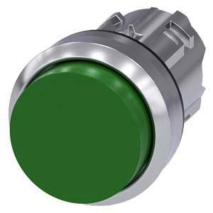 Drucktaster, 22 mm, rund, Metall, hochglanz, grün, Druckknopf, hoch tastend Drucktaster SIRIUS ACT zur Schaltung und Steuerung elektrischer Verbraucher. Unter dem Markennamen SIRIUS ACT bietet Siemens ein einzigartiges Portfolio an Befehls- und Meldegeräten mit weltweiten Produkt-Zulassungen in drei modernen Designreihen aus robustem Echtmetall und hochwertigem Kunststoff. Das innovative Aufschnappkonzept vereinfacht die Montage so weit, dass dafür nur eine Hand und kein Spezialwerkzeug erforderlich ist. Als Montagebohrungen genügen nutfreie Löcher, da bereits ein 100%iger Verdrehschutz integriert ist. Dank der durchgängig hohen Schutzart sind die robusten Geräte industrietauglich und für den Außeneinsatz geeignet. Sogar die Reinigung mit Hochdruckstrahl ist möglich. Weder Staub, Öle noch aggressive Laugen können den zuverlässigen Betrieb stören. Neben der Standardverdrahtung können die meisten Geräte auch über PROFINET, AS-Interface oder IO-Link an die Steuerung angebunden werden. Damit reduzieren Sie Ihren Verdrahtungsaufwand, minimieren Fehlerquellen und gewinnen mehr Flexibilität. Komfortabel unterstützt der grafische Online-Konfigurator bei Auswahl und Bestellung von Einzelgeräten, Gehäusen und Beschriftungen. Umfangreiche Dokumentation (z.B. Handbuch, 3D-Daten, Anschlussdiagramm) ist verfügbar. Lieferbare Ausführungen: mehrere Farben, beleuchtet/unbeleuchtet, mit/ohne Beschriftung, verrastende/tastende Betätigung, verschiedene Druckknopf- und Frontringhöhen. Hinweis: Einzelgerät, Halter und Module bitte extra bestellen. SIRIUS ACT - Performance in Action beim Befehlen und Melden. Einfach montiert, einfach stark, einfach perfekt.