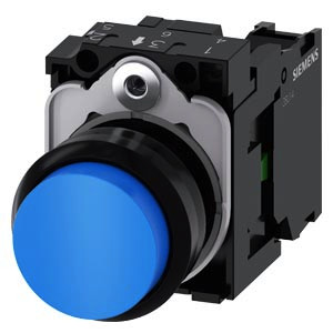 Drucktaster, 22 mm, rund, Kunststoff, blau, Druckknopf, hoch, tastend, mit Halter 1S, Schraubanschluss Drucktaster SIRIUS ACT zur Schaltung und Steuerung elektrischer Verbraucher. Unter dem Markennamen SIRIUS ACT bietet Siemens ein einzigartiges Portfolio an Befehls- und Meldegeräten mit weltweiten Produkt-Zulassungen in drei modernen Designreihen aus robustem Echtmetall und hochwertigem Kunststoff. Das innovative Aufschnappkonzept vereinfacht die Montage so weit, dass dafür nur eine Hand und kein Spezialwerkzeug erforderlich ist. Als Montagebohrungen genügen nutfreie Löcher, da bereits ein 100%iger Verdrehschutz integriert ist. Dank der durchgängig hohen Schutzart sind die robusten Geräte industrietauglich und für den Außeneinsatz geeignet. Sogar die Reinigung mit Hochdruckstrahl ist möglich. Weder Staub, Öle noch aggressive Laugen können den zuverlässigen Betrieb stören. Neben der Standardverdrahtung können die meisten Geräte auch über PROFINET, AS-Interface oder IO-Link an die Steuerung angebunden werden. Damit reduzieren Sie Ihren Verdrahtungsaufwand, minimieren Fehlerquellen und gewinnen mehr Flexibilität. Komfortabel unterstützt der grafische Online-Konfigurator bei Auswahl und Bestellung von Einzelgeräten, Gehäusen und Beschriftungen. Umfangreiche Dokumentation (z.B. Handbuch, 3D-Daten, Anschlussdiagramm) ist verfügbar. Lieferbare Ausführungen: mehrere Farben, beleuchtet/unbeleuchtet, mit/ohne Beschriftung, verrastende/tastende Betätigung, verschiedene Druckknopf- und Frontringhöhen. Hinweis: Komplettgerät, Lieferung inklusive Halter und Module. SIRIUS ACT - Performance in Action beim Befehlen und Melden. Einfach montiert, einfach stark, einfach perfekt.