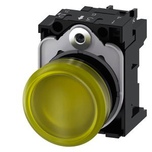 Leuchtmelder, 22 mm, rund, Kunststoff, gelb, Linse, glatt, mit Halter, LED-Modul mit integrierter LED AC 110 V, Schraubanschluss Leuchtmelder SIRIUS ACT zur Signalisierung von Schaltzuständen oder Störungen in Anlagen mit brillianter Leuchtkraft dank energieeffizienter LED-Technologie. Unter dem Markennamen SIRIUS ACT bietet Siemens ein einzigartiges Portfolio an Befehls- und Meldegeräten mit weltweiten Produkt-Zulassungen in drei modernen Designreihen aus robustem Echtmetall und hochwertigem Kunststoff. Das innovative Aufschnappkonzept vereinfacht die Montage so weit, dass dafür nur eine Hand und kein Spezialwerkzeug erforderlich ist. Als Montagebohrungen genügen nutfreie Löcher, da bereits ein 100%iger Verdrehschutz integriert ist. Dank der durchgängig hohen Schutzart sind die robusten Geräte industrietauglich und für den Außeneinsatz geeignet. Sogar die Reinigung mit Hochdruckstrahl ist möglich. Weder Staub, Öle noch aggressive Laugen können den zuverlässigen Betrieb stören. Neben der Standardverdrahtung können die meisten Geräte auch über PROFINET, AS-Interface oder IO-Link an die Steuerung angebunden werden. Damit reduzieren Sie Ihren Verdrahtungsaufwand, minimieren Fehlerquellen und gewinnen mehr Flexibilität. Komfortabel unterstützt der grafische Online-Konfigurator bei Auswahl und Bestellung von Einzelgeräten, Gehäusen und Beschriftungen. Umfangreiche Dokumentation (z.B. Handbuch, 3D-Daten, Anschlussdiagramm) ist verfügbar. Lieferbare Ausführungen: mehrere Farben, verschiedene Spannungsvarianten. Hinweis: Komplettgerät, Lieferung inklusive Halter und Module. SIRIUS ACT - Performance in Action beim Befehlen und Melden. Einfach montiert, einfach stark, einfach perfekt.