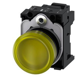 Leuchtmelder, 22 mm, rund, Kunststoff, gelb, Linse, glatt, mit Halter, LED-Modul mit integrierter LED AC 110 V, Federzuganschluss Leuchtmelder SIRIUS ACT zur Signalisierung von Schaltzuständen oder Störungen in Anlagen mit brillianter Leuchtkraft dank energieeffizienter LED-Technologie. Unter dem Markennamen SIRIUS ACT bietet Siemens ein einzigartiges Portfolio an Befehls- und Meldegeräten mit weltweiten Produkt-Zulassungen in drei modernen Designreihen aus robustem Echtmetall und hochwertigem Kunststoff. Das innovative Aufschnappkonzept vereinfacht die Montage so weit, dass dafür nur eine Hand und kein Spezialwerkzeug erforderlich ist. Als Montagebohrungen genügen nutfreie Löcher, da bereits ein 100%iger Verdrehschutz integriert ist. Dank der durchgängig hohen Schutzart sind die robusten Geräte industrietauglich und für den Außeneinsatz geeignet. Sogar die Reinigung mit Hochdruckstrahl ist möglich. Weder Staub, Öle noch aggressive Laugen können den zuverlässigen Betrieb stören. Neben der Standardverdrahtung können die meisten Geräte auch über PROFINET, AS-Interface oder IO-Link an die Steuerung angebunden werden. Damit reduzieren Sie Ihren Verdrahtungsaufwand, minimieren Fehlerquellen und gewinnen mehr Flexibilität. Komfortabel unterstützt der grafische Online-Konfigurator bei Auswahl und Bestellung von Einzelgeräten, Gehäusen und Beschriftungen. Umfangreiche Dokumentation (z.B. Handbuch, 3D-Daten, Anschlussdiagramm) ist verfügbar. Lieferbare Ausführungen: mehrere Farben, verschiedene Spannungsvarianten. Hinweis: Komplettgerät, Lieferung inklusive Halter und Module. SIRIUS ACT - Performance in Action beim Befehlen und Melden. Einfach montiert, einfach stark, einfach perfekt.