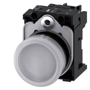Leuchtmelder, 22 mm, rund, Kunststoff, weiß, Linse, glatt, mit Halter, LED-Modul mit integrierter LED AC 110 V, Schraubanschluss Leuchtmelder SIRIUS ACT zur Signalisierung von Schaltzuständen oder Störungen in Anlagen mit brillianter Leuchtkraft dank energieeffizienter LED-Technologie. Unter dem Markennamen SIRIUS ACT bietet Siemens ein einzigartiges Portfolio an Befehls- und Meldegeräten mit weltweiten Produkt-Zulassungen in drei modernen Designreihen aus robustem Echtmetall und hochwertigem Kunststoff. Das innovative Aufschnappkonzept vereinfacht die Montage so weit, dass dafür nur eine Hand und kein Spezialwerkzeug erforderlich ist. Als Montagebohrungen genügen nutfreie Löcher, da bereits ein 100%iger Verdrehschutz integriert ist. Dank der durchgängig hohen Schutzart sind die robusten Geräte industrietauglich und für den Außeneinsatz geeignet. Sogar die Reinigung mit Hochdruckstrahl ist möglich. Weder Staub, Öle noch aggressive Laugen können den zuverlässigen Betrieb stören. Neben der Standardverdrahtung können die meisten Geräte auch über PROFINET, AS-Interface oder IO-Link an die Steuerung angebunden werden. Damit reduzieren Sie Ihren Verdrahtungsaufwand, minimieren Fehlerquellen und gewinnen mehr Flexibilität. Komfortabel unterstützt der grafische Online-Konfigurator bei Auswahl und Bestellung von Einzelgeräten, Gehäusen und Beschriftungen. Umfangreiche Dokumentation (z.B. Handbuch, 3D-Daten, Anschlussdiagramm) ist verfügbar. Lieferbare Ausführungen: mehrere Farben, verschiedene Spannungsvarianten. Hinweis: Komplettgerät, Lieferung inklusive Halter und Module. SIRIUS ACT - Performance in Action beim Befehlen und Melden. Einfach montiert, einfach stark, einfach perfekt.