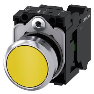 Drucktaster, 22 mm, rund, Metall, hochglanz, gelb, Druckknopf, flach, tastend, 1S, Federzuganschluss Drucktaster SIRIUS ACT zur Schaltung und Steuerung elektrischer Verbraucher. Unter dem Markennamen SIRIUS ACT bietet Siemens ein einzigartiges Portfolio an Befehls- und Meldegeräten mit weltweiten Produkt-Zulassungen in drei modernen Designreihen aus robustem Echtmetall und hochwertigem Kunststoff. Das innovative Aufschnappkonzept vereinfacht die Montage so weit, dass dafür nur eine Hand und kein Spezialwerkzeug erforderlich ist. Als Montagebohrungen genügen nutfreie Löcher, da bereits ein 100%iger Verdrehschutz integriert ist. Dank der durchgängig hohen Schutzart sind die robusten Geräte industrietauglich und für den Außeneinsatz geeignet. Sogar die Reinigung mit Hochdruckstrahl ist möglich. Weder Staub, Öle noch aggressive Laugen können den zuverlässigen Betrieb stören. Neben der Standardverdrahtung können die meisten Geräte auch über PROFINET, AS-Interface oder IO-Link an die Steuerung angebunden werden. Damit reduzieren Sie Ihren Verdrahtungsaufwand, minimieren Fehlerquellen und gewinnen mehr Flexibilität. Komfortabel unterstützt der grafische Online-Konfigurator bei Auswahl und Bestellung von Einzelgeräten, Gehäusen und Beschriftungen. Umfangreiche Dokumentation (z.B. Handbuch, 3D-Daten, Anschlussdiagramm) ist verfügbar. Lieferbare Ausführungen: mehrere Farben, beleuchtet/unbeleuchtet, mit/ohne Beschriftung, verrastende/tastende Betätigung, verschiedene Druckknopf- und Frontringhöhen. Hinweis: Komplettgerät, Lieferung inklusive Halter und Module. SIRIUS ACT - Performance in Action beim Befehlen und Melden. Einfach montiert, einfach stark, einfach perfekt.