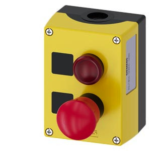 Gehäuse für Befehlsgeräte, 22 mm, rund, Gehäusematerial Kunststoff, Gehäuseoberteil gelb, 2 Befehlsstellen Kunststoff, B=Leuchtmelder rot, LED 24 V, Schraubanschluss, LED 24 V, Schraubanschluss, Schild ohne Aufschrift, A=NOT-HALT 40 mm drehentriegelt, Schild ohne Aufschrift, 1S, 1Ö, 1Ö, Schraubanschluss, Bodenbefestigung, oben und unten je 1x M20, Schilder beigelegt Gehäuse SIRIUS ACT für die Montage der 22,5 mm Befehls- und Meldegeräte bei räumlich getrennter Anordnung von Steuereinheiten und Schaltschränken. Unter dem Markennamen SIRIUS ACT bietet Siemens ein einzigartiges Portfolio an Befehls- und Meldegeräten mit weltweiten Produkt-Zulassungen in drei modernen Designreihen aus robustem Echtmetall und hochwertigem Kunststoff. Das innovative Aufschnappkonzept vereinfacht die Montage so weit, dass dafür nur eine Hand und kein Spezialwerkzeug erforderlich ist. Als Montagebohrungen genügen nutfreie Löcher, da bereits ein 100%iger Verdrehschutz integriert ist. Dank der durchgängig hohen Schutzart sind die robusten Geräte industrietauglich und für den Außeneinsatz geeignet. Sogar die Reinigung mit Hochdruckstrahl ist möglich. Weder Staub, Öle noch aggressive Laugen können den zuverlässigen Betrieb stören. Neben der Standardverdrahtung können die meisten Geräte auch über PROFINET, AS-Interface oder IO-Link an die Steuerung angebunden werden. Damit reduzieren Sie Ihren Verdrahtungsaufwand, minimieren Fehlerquellen und gewinnen mehr Flexibilität. Komfortabel unterstützt der grafische Online-Konfigurator bei Auswahl und Bestellung von Einzelgeräten, Gehäusen und Beschriftungen. Umfangreiche Dokumentation (z.B. Handbuch, 3D-Daten, Anschlussdiagramm) ist verfügbar. Lieferbare Ausführungen: gelb/grau, Kunststoff/Metall, 1-6 Befehlstellen, Leergehäuse/Vorbestückung, wahlweise mit AS-Interface-Anbindung. SIRIUS ACT - Performance in Action beim Befehlen und Melden. Einfach montiert, einfach stark, einfach perfekt.