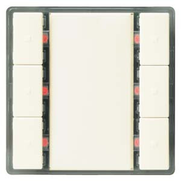 - Taster mit drei Tasterpaaren - Horizontale Bedienung - Pro Taste wählbare Funktion, Szenenbaustein - LED zur Orientierungsbeleuchtung - Beschriftungsfeld - Raumtemperaturfühler - Aufsteckbar auf Busankoppler (BTM) oder Unterputzaktorik