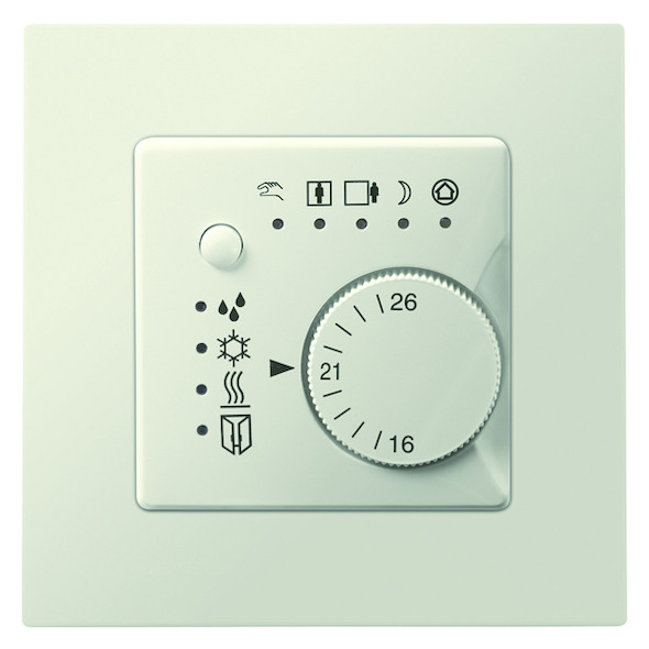 Regelung einstellbar als Zweipunkt-Regelung und/oder stetige Regelung (P- bzw. PI-Algorithmus), für reinen Heizbetrieb, reinen Kühlbetrieb, Heiz- und Kühlbetrieb, Taster zum lokalen Umschalten zwischen Hand- und Automatikbetrieb, über einen austauschbaren Drehknopf am Regler einstellbarer Sollwert in °C für Komfortbetrieb, zweistufiges Heizen oder Kühlen, Aufstecken auf einen Busankoppler (BTM) bzw. UP-Aktorik mit Busankoppler (BTM) - Integrierter Raumtemperaturfühler - Regelung einstellbar als Zweipunkt-Regelung und/oder stetige Regelung (P- bzw. PI-Algorithmus), für reinen Heizbetrieb, reinen Kühlbetrieb, Heiz- und Kühlbetrieb - Über den KNX umschaltbare Betriebsarten Komfortbetrieb, Pre-Komfort, Energiespar- und Frost- bzw. Hitzeschutzbetrieb - Präsenztaster zum lokalen Umschalten zwischen Komfort- und Pre-Komfortbetrieb bzw. zwischen Komfort- und Energiesparbetrieb sowie zur Verlängerung des Komfortbetriebs nach Aktivierung des Energiesparbetriebs oder Schutzbetriebs - Taster zum lokalen Umschalten zwischen Hand- und Automatikbetrieb - Über einen austauschbaren Drehknopf am Regler (+/-) sowie über den KNX einstellbare Verschiebung des Raumtemperatur-Sollwertes für Komfortbetrieb - Über den KNX vorgebbarer Basis-Sollwert der Raumtemperatur für Komfortbetrieb - Über einen austauschbaren Drehknopf am Regler einstellbarer Sollwert in °C für Komfortbetrieb - Einstellbare Totzone zwischen dem Sollwert Heizen und dem Sollwert Kühlen für Komfortbetrieb - Zweistufiges Heizen oder Kühlen - Ausgabe der Stellgröße(n) wahlweise als Schaltbefehl Ein/Aus oder als Stellbefehl im Bereich 0...100 % - 5 LEDs zur Anzeige Handbetrieb und der aktuellen Betriebsarten - 4 LEDs zur Anzeige Heiz- bzw. Kühlventil geöffnet, Taupunktalarm und geöffnetes Fenster - Aufstecken auf einen Busankoppler (BTM) bzw. UP-Aktorik mit Busankoppler (BTM) - titanweiß