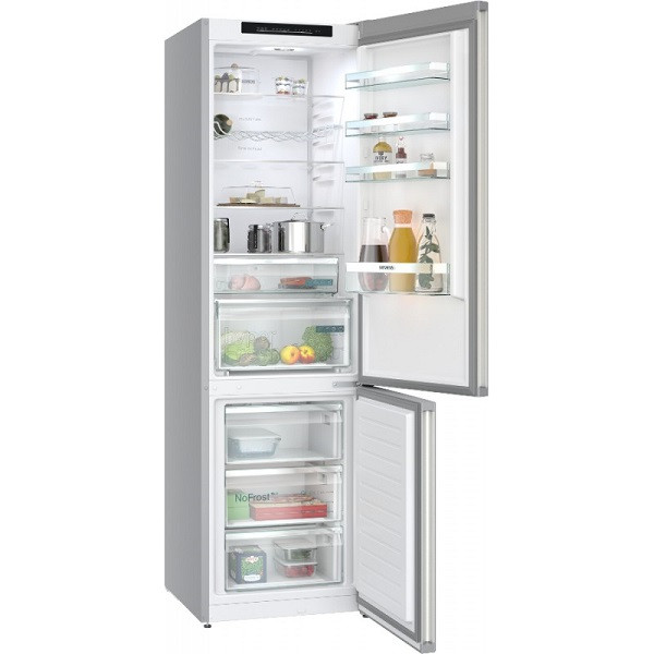 Die Siemens KG39N2IAG ist eine freistehende Kühl-Gefrier-Kombination aus der iQ300-Serie, die modernes Design mit hoher Energieeffizienz und innovativer Kühltechnologie vereint. Mit einer Höhe von 203 cm, einer Breite von 60 cm und einer Tiefe von 66,5 cm bietet sie insgesamt 363 Liter Nutzinhalt - 260 Liter im Kühlbereich und 103 Liter im Gefrierteil. Dank der Total noFrost-Technologie entfällt das manuelle Abtauen vollständig, da die Feuchtigkeit aus der Luft entzogen wird, wodurch Eisbildung verhindert wird. Das multiAirflow-System sorgt für eine gleichmäßige Luftzirkulation im gesamten Kühlraum, wodurch Temperaturschwankungen minimiert und die Frische der Lebensmittel länger erhalten bleibt. Die hyperFresh 0°C-Schubladen bieten optimale Lagerbedingungen für empfindliche Lebensmittel wie Fisch, Fleisch, Obst und Gemüse. Durch die getrennte Temperaturregelung für Kühl- und Gefrierbereich können die Bedingungen individuell angepasst werden. Mit der Energieeffizienzklasse A und einem Jahresenergieverbrauch von 112 kWh ist die KG39N2IAG besonders sparsam. Zudem arbeitet sie mit einem Geräuschpegel von nur 29 dB(A) äußerst leise, was sie ideal für offene Wohnküchen macht. Die Ausstattung umfasst unter anderem fünf Sicherheitsglasablagen, davon drei in der Höhe verstellbar, ein verchromtes Flaschenregal, LED-Innenbeleuchtung mit dimLight sowie SuperKühlen- und SuperGefrieren-Funktionen. Die Hochglanz-Rückwand mit multiAirflow-System ermöglicht eine flexible Platzierung direkt an der Wand oder in einer Nische. Siemens Home Appliances +3. Das Gerät ist in gebürstetem Edelstahl mit Anti-Fingerprint-Beschichtung gehalten, was nicht nur für eine edle Optik sorgt, sondern auch die Reinigung erleichtert. Die Klimaklasse SN-T ermöglicht einen Betrieb bei Umgebungstemperaturen von +10 °C bis +43 °C.
