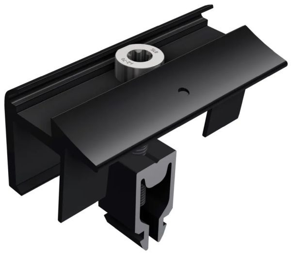 Endklemme mit Erdungspin für Potentialausgleich, schwarz eloxiert, für Rahmenhöhen von 28-45 mm, horizontal oder vertikal einsetzbar, komplett vormontiert und kompatibel zu allen SL Rack Systemen, Klemmlänge 70 mm und Klemmtiefe 11 mm für sichere Modulbefestigung, integrierter Mitnehmer zum Öffnen der Klemmen sorgt für einfaches Handling, bequem von oben verschraubbar ohne Eindrehen der Klemme, Länge 70 mm, Breite 34 mm, Höhe 65 mm, Material Aluminium, Schrauben Edelstahl, Gewicht 0,070 kg