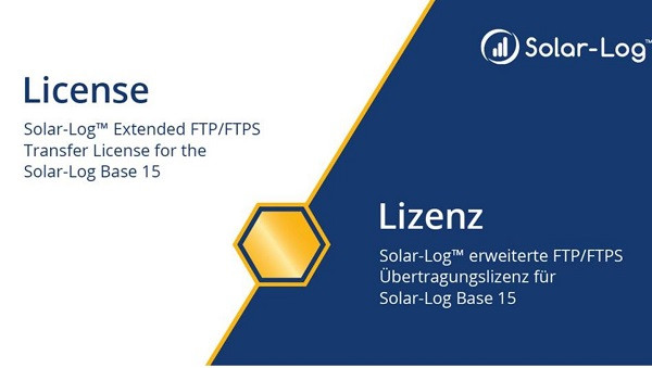Solar-Log™ FTP/FTPS Lizenz 257064 für SolarLog Base 15 Die FTP/FTPS Lizenz erweitert die Möglichkeiten für den Datenexport auf Fremdportale. Mit dieser Lizenz kann der Solar-Log Base 15 die Daten mehrmalig, zyklisch übertragen.