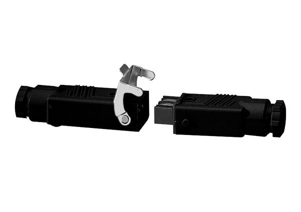 Hirschmann Steckverbindungs-Kit: Schwarze Steckverbindung IP54 für max. 16 A. Das Kit beinhaltet Kupplung, Stecker und Sicherungsbügel STAS2.