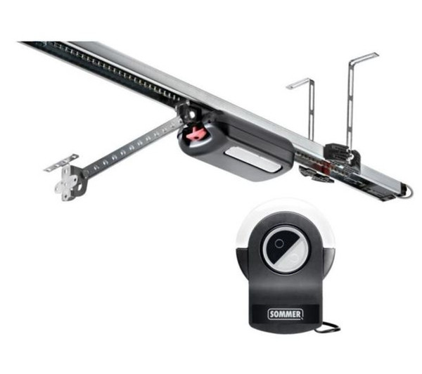 Laufwagen mit integriertem Funkempfänger (FM 868,95 MHz SOMloq2, 40 Funkspeicherplätze), Steuerungsgehäuse mit zwei integrierten Innentaster, LED-Beleuchtung im Laufwagen, vorprogrammierter 4-Befehl-Handsender Pearl Vibe (#?4019V000) mit fühlbarer Rückmeldung von Funkbefehlen durch Vibration, 3-teilige Laufschiene, Laufwagen, Steuerungsgehäuse, Deckenaufhängung, Sturzbefestigung, Schubarm, Torbeschlagwinkel und Befestigungsmaterial