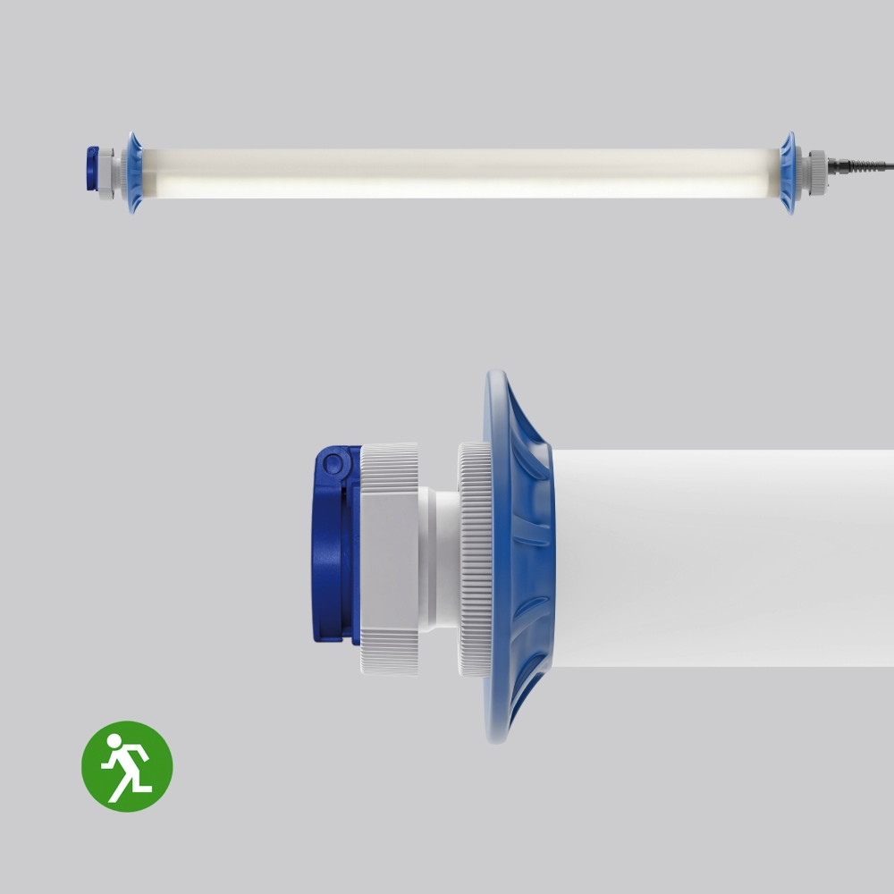 Schutzrohr Kunststoff (Polycarbonat) opal, schlagzäh. Endkappen aus Kunststoff (Polyamid) grau. Protektoren aus weichem Kunststoff an den Enden zum Schutz beim mobilen Einsatz. Homogene, weiche und blendreduzierte Ausleuchtung. Schwere Gummischlauchzuleitung H07RN-F für hohe mechanische Belastungen mit Netzstecker. Eine Steckdose ermöglicht den Anschluss weiterer Leuchten oder elektrischer Geräte. Durch Zubehör (optional) für Wand-, Decken- und Pendelmontage geeignet. Zur Leuchte ist immer ein Montagezubehör mit zu bestellen. Leuchte mit begrenzter Oberflächentemperatur nach DIN EN 60598-2-24. Notlichtfunktion: Bei einem Stromausfall schaltet die Leuchte in den Notlichtbetrieb mit reduziertem Leuchtenlichtstrom. Die maximale Leuchtdauer im Notlichtbetrieb beträgt bei vollständig geladenem Akku 120 min. Notlichtfunktion für Transport oder Lagerung deaktivierbar.