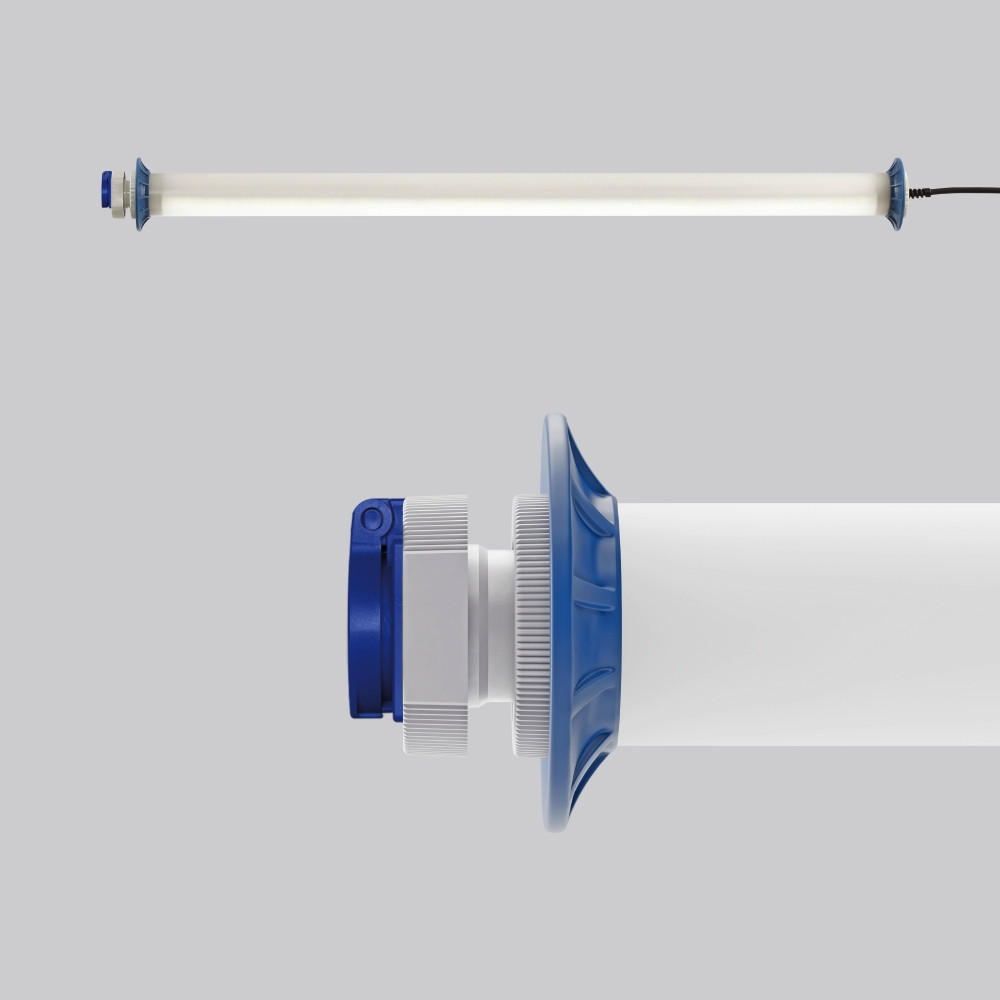 Schutzrohr Kunststoff (Polycarbonat) opal, schlagzäh. Endkappen aus Kunststoff (Polyamid) grau. Protektoren aus weichem Kunststoff an den Enden zum Schutz beim mobilen Einsatz. Homogene, weiche und blendreduzierte Ausleuchtung. Betriebsgerät integriert. Eine Steckdose ermöglicht den Anschluss weiterer Leuchten oder elektrischer Geräte. Schwere Gummischlauchzuleitung H07RN-F für hohe mechanische Belastungen mit Netzstecker. Durch Zubehör (optional) für Wand-, Decken- und Pendelmontage geeignet. Zur Leuchte ist immer ein Montagezubehör mit zu bestellen. Leuchte mit begrenzter Oberflächentemperatur nach DIN EN 60598-2-24.