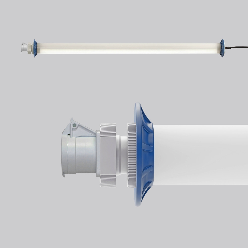 Schutzrohr Kunststoff (Polycarbonat) opal, schlagzäh. Endkappen aus Kunststoff (Polyamid) grau. Protektoren aus weichem Kunststoff an den Enden zum Schutz beim mobilen Einsatz. Homogene, weiche und blendreduzierte Ausleuchtung. Betriebsgerät integriert. Eine Steckdose ermöglicht den Anschluss weiterer Leuchten oder elektrischer Geräte. Schwere Gummischlauchzuleitung H07RN-F für hohe mechanische Belastungen mit Netzstecker. Durch Zubehör (optional) für Wand-, Decken- und Pendelmontage geeignet. Zur Leuchte ist immer ein Montagezubehör mit zu bestellen. Leuchte mit begrenzter Oberflächentemperatur nach DIN EN 60598-2-24.
