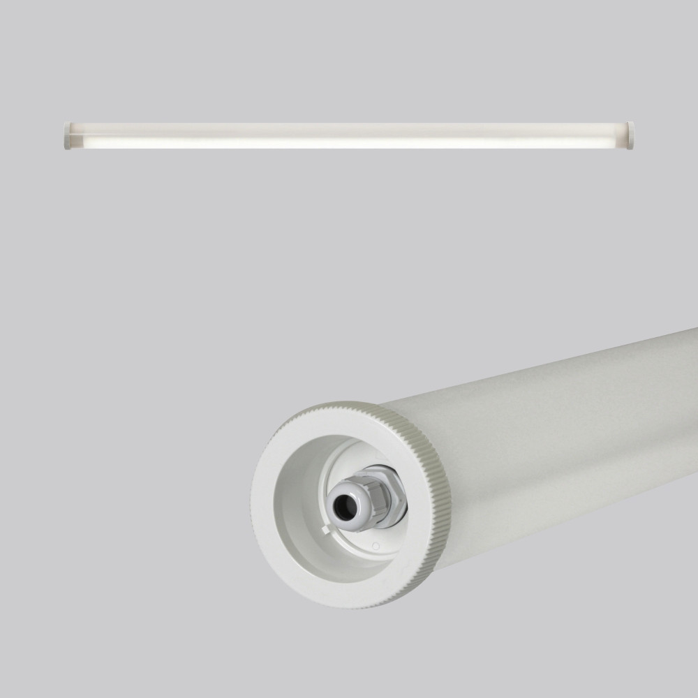 Schutzrohr Kunststoff (Polycarbonat) opal, schlagzäh. Endkappen aus Kunststoff (Polyamid) grau. Homogene, weiche und blendreduzierte Ausleuchtung. Betriebsgerät integriert. 1 Kabeleinführung. Ohne Durchgangsverdrahtung. Durch Zubehör (optional) für Wand-, Decken- und Pendelmontage geeignet. Zur Leuchte ist immer ein Montagezubehör mit zu bestellen. Leuchte mit begrenzter Oberflächentemperatur nach DIN EN 60598-2-24.