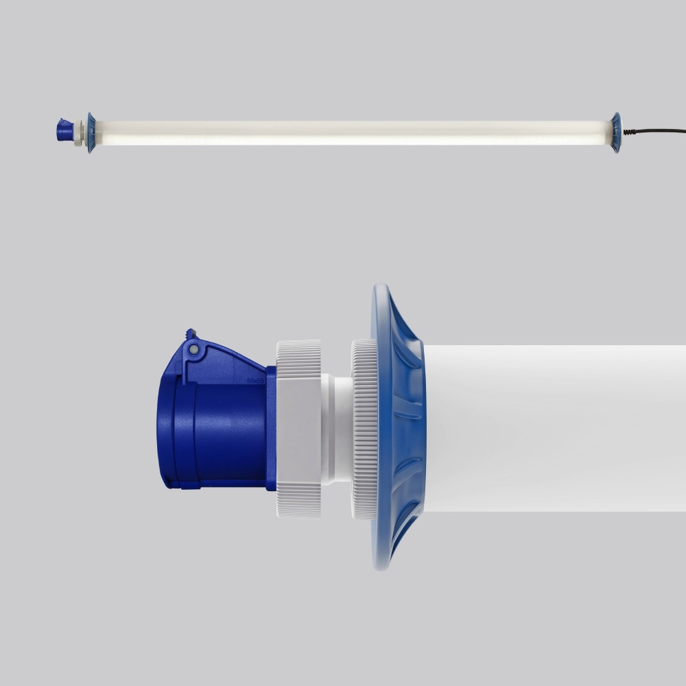 Schutzrohr Kunststoff (Polycarbonat) opal, schlagzäh. Endkappen aus Kunststoff (Polyamid) grau. Protektoren aus weichem Kunststoff an den Enden zum Schutz beim mobilen Einsatz. Homogene, weiche und blendreduzierte Ausleuchtung. Betriebsgerät integriert. Eine Steckdose ermöglicht den Anschluss weiterer Leuchten oder elektrischer Geräte. Schwere Gummischlauchzuleitung H07RN-F für hohe mechanische Belastungen mit Netzstecker. Durch Zubehör (optional) für Wand-, Decken- und Pendelmontage geeignet. Zur Leuchte ist immer ein Montagezubehör mit zu bestellen. Leuchte mit begrenzter Oberflächentemperatur nach DIN EN 60598-2-24.