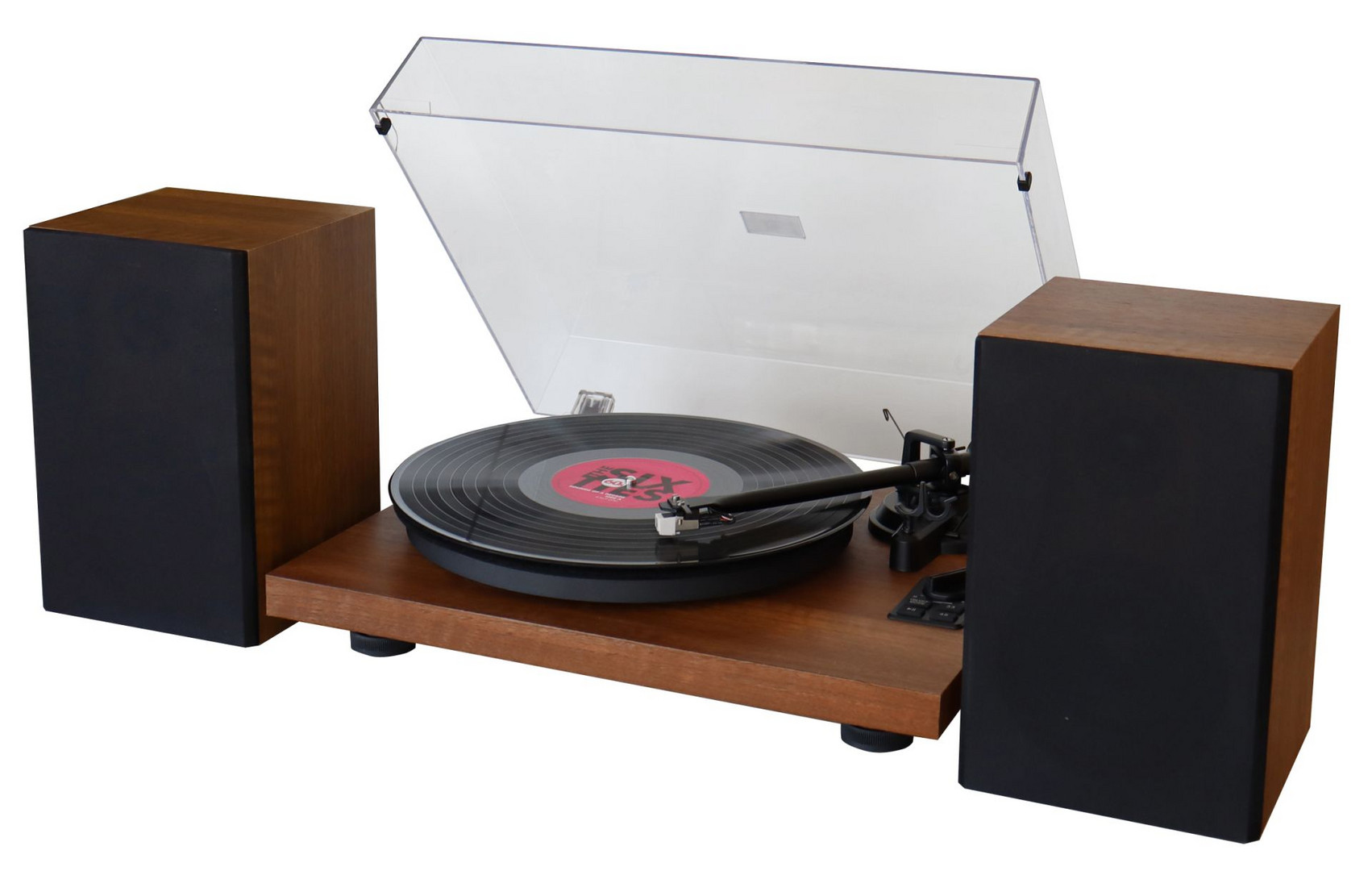 Plattenspieler 33/45 UpM, Magnettonabnehmersystem, Metall Plattenteller, Bluetooth® Empfangsfunktion, 2 Wege Bass Reflex Lautsprecher, Ausgangsleistung 2 x 18 W RMS, Eingebauter Entzerrer-Vorverstärker PHONO/LINE-OUT umschaltbar, USB-Anschluss für PC-Aufnahme, Anti Skating, Tonarmauflagegewicht einstellbar, AC/DC Netzadapter (15 V/2,4 A), Single Adapter, Plattenspieler Matte, Abdeckhaube inkl.