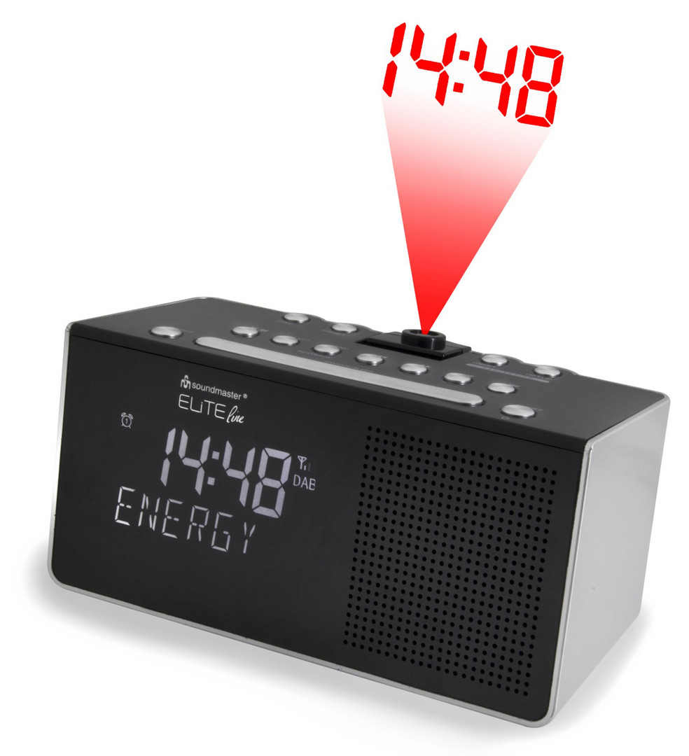 Schwenkbare/180° drehbare zuschaltbare Zeitprojektion an Wand oder Decke, DAB+/UKW-RDS Radio, Vollautomatische Zeit-/Datumseinstellung durch RadiofunksignalJumbo LCD Anzeige mit 3-stufigem Dimmer, Je 10 Festsenderspeicherplätze, 2 Weckzeiten mit Wochenendfunktion, Einschlaf-/Schlummerfunktion, Wecken mit Radio/Signalton, 1 A USB-Ladebusche, AC/DC Netzadapter 5 V/2 A inkl.