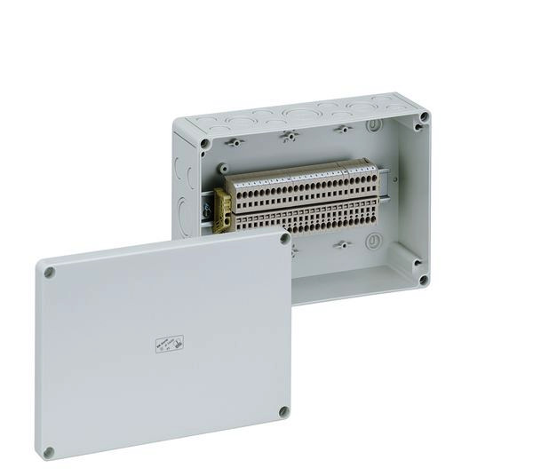 Reihenklemmengehäuse, mit Schutzart IP54/IP66, Nennquerschnitt 4mm², Ui=400V AC, Polycarbonat, innenliegende Befestigungsstellen, für Installationen im industriellen Umfeld und geschütztem Außenbereich, bestückt mit 25 schraubenlosen Klemmen 4mm² (Typ Weidmüller ZDU 4)