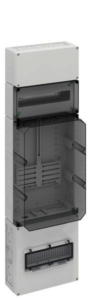 Zählerverteilung in Mehrfach-Kastenbauform nach DIN EN 61439-2/-3, serienmäßig plombierbar, zur Aufputz-Montage im ungemessenen Bereich, Geräte-Einbauflächen nach DIN 43870-1, Zähleranschlussleitungen 5-polig. Einsatz nach individueller Freigabe durch den zuständigen Netzbetreiber, mit Verschlussstopfen, mit beiliegenden Belüftungsstopfen IP44 zur Verminderung von Kondenswasser, mit Isolierstopfen, Oberer Anschlussraum, 150mm, ausgerüstet mit 35mm Normschiene zur Aufnahme der Hauptleitungsabzweigklemme HA 25-53 (Zubehör), Raum für Zusatzanwendungen, 150mm, 12TE, ausgerüstet mit 35mm Normschiene zur Aufnahme von zusätzlichen Betriebsmitteln des Netzbetreibers, Messstellenbetreibers oder Messdienstleisters, mit plombierbarer Berührungsschutzabdeckung und transparentem Deckel, Zählerfeld, 450mm, mit transparentem Deckel, für 1 Zähler mit Drei-Punkt-Befestigung, mit montiertem Zählerkreuz für Drehstromzähler und Zählerbefestigungsschrauben, Befestigungsmaße nach DIN 43870-2, Unterer Anschlussraum, 300mm, serienmäßig plombierbar, mit 35mm Normschiene für Hauptsicherungsautomat, mit PE/N-Doppelklemmen, mit Klappfenster 12TE für Laienbedienung der Hauptsicherungsautomaten und zusätzlichem Raum für Überspannungsschutzgeräte, Leitungseinführung durch Kabelverschraubung (IP65, Zubehör) oder Stufennippel M40 (IP55, beiliegend)