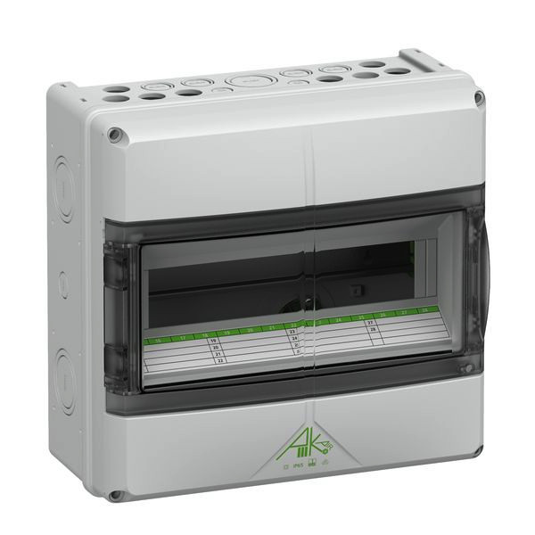 Kleinverteiler, mit Schutzart IP65, UL Type Rating 3R, 12/12K, mit integrierten Belüftungselementen zur Verminderung der Kondenswasserbildung, Bemessungsbetriebsspannung: 400V AC, Bemessungsisolationsspannung: 1000V AC, 1500V DC, zertifiziert durch VDE (DIN EN 60670-1/-24 (VDE 0606-1/-24)), UL (UL 50 & CSA 22.2 No. 94.1-07, UL 50E & CSA C22.2 No. 94.2-07), UL-EU (EN 62208), UL-EU (EN 61439-1/-2), UL-EU (EN 61439-1/-3), DLG (Ammoniakbeständigkeit), oben und unten metrische Vorprägungen für universelle Leitungseinführungen mit Kabelverschraubungen und / oder Doppelmembranstutzen, oben 10 offene Leitungseinführungen für UL-konforme Leitungseinführungen, für die Installation im industriellen Umfeld und im geschützten Außenbereich, 1-reihig, 14 Teilungseinheiten, ohne PE/N-Klemmschiene