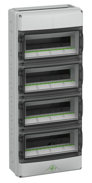 Kleinverteiler, mit Schutzart IP65, UL Type Rating 3R, 12/12K, Flansch-Type, mit integrierten Belüftungselementen zur Verminderung der Kondenswasserbildung, Bemessungsbetriebsspannung: 400V AC, Bemessungsisolationsspannung: 1000V AC, 1500V DC, zertifiziert durch VDE (DIN EN 60670-1/-24 (VDE 0606-1/-24)), UL (UL 50 & CSA 22.2 No. 94.1-07, UL 50E & CSA C22.2 No. 94.2-07), UL-EU (EN 62208), UL-EU (EN 61439-1/-2), UL-EU (EN 61439-1/-3), UL-EU (EN 61439-1 & EN IEC 61439-7), DLG (Ammoniakbeständigkeit), oben und unten offene Stirnflächen zur Montage von verschiedenen Flanschen oder zur Kombination mehrerer AK-F Gehäuse mittels Kombiflansch, für die Installation im industriellen Umfeld und im geschützten Außenbereich, 4-reihig, 56 Teilungseinheiten, ohne PE/N-Klemmschiene