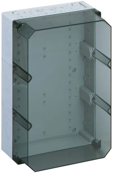 Leergehäuse, mit Schutzart IP65, Polycarbonat, glasfaserverstärkt, Ui=690V AC, Ui=1000V DC, innenliegende Befestigungsstellen, für Installationen im industriellen Umfeld und geschütztem Außenbereich, Kasten: Polycarbonat, glasfaserverstärkt, Deckel: Polycarbonat, transparent, Ausschlagmembranen, M20/M25/M32/M40, (66 seitlich)