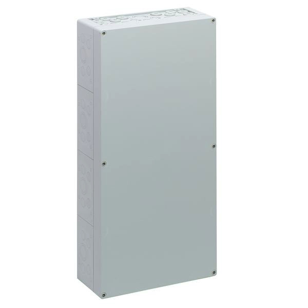 Leergehäuse, mit Schutzart IP65, Polycarbonat, glasfaserverstärkt, Ui=690V AC, Ui=1000V DC, innenliegende Befestigungsstellen, für Installationen im industriellen Umfeld und geschütztem Außenbereich, Kasten: Polycarbonat, glasfaserverstärkt, Deckel: Polycarbonat, grau, Ausschlagmembranen, M20/M25/M32/M40, (76 seitlich)