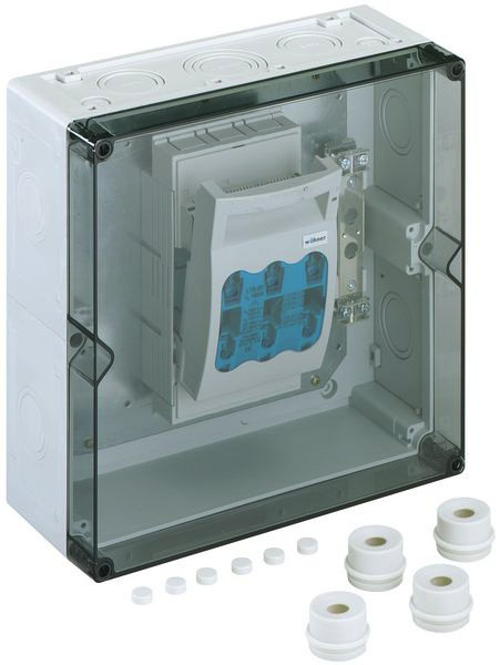 NH-Sicherungs-Lasttrennschaltergehäuse, IP65 (bei Verwendung entsprechender Kabeleinführungen), 1 x NH 00-Sicherungs-Lasttrennschalter, montiert auf Montageplatte, Bemessungsstrom 125 A, Schellenanschluss 1,5-70mm², PE/N-Klemme 2 x 50mm², mit IP54 Anbaustutzen, mit Isolierstopfen, mit transparentem Deckel