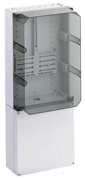 Zählergehäuse, Geräte-Einbaufläche Zählerfeld nach DIN 43870-1, mit transparentem Deckel, serienmäßig plombierbar, mit montiertem Zählerkreuz für Drehstromzähler und Zählerbefestigungsschrauben, separater, zusätzlicher Anschlussraum unten 300mm, mit 35mm Normschiene, mit Doppelmembranstutzen, Verschluss- und Isolierstopfen,