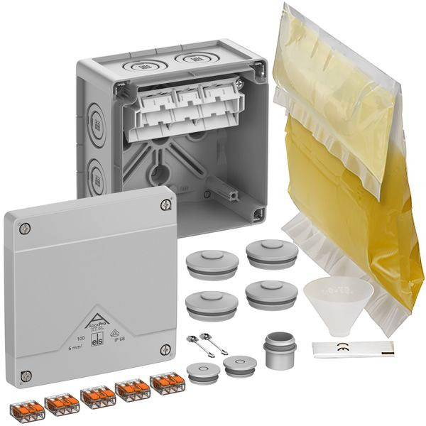 Beigefügtes Zubehör: 4 Doppelmembranstutzen IP66 M32 Dichtbereich 13-21mm, 2 Verschlusstopfen M20, 1 Anbaustutzen M20, Deckelverliersicherung, 1 Gießharzbeutel GHB Pro 4 mit Einfülltrichter und Einweghandschuhen