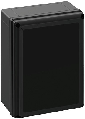 Leergehäuse, geeignet für die Installation in rauen Umgebungen und im ungeschützten Außenbereich, Kasten: glasfaserverstärktes Polycarbonat, schwarz, ähnlich RAL 9005, Deckel: Polycarbonat, mit schwarzem Deckel