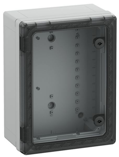 Schaltschrank, geeignet für die Installation in rauen Umgebungen und im ungeschützten Außenbereich, Kasten und Rahmen: glasfaserverstärktes Polycarbonat, grau, ähnlich RAL 7035, Tür: Polycarbonat.