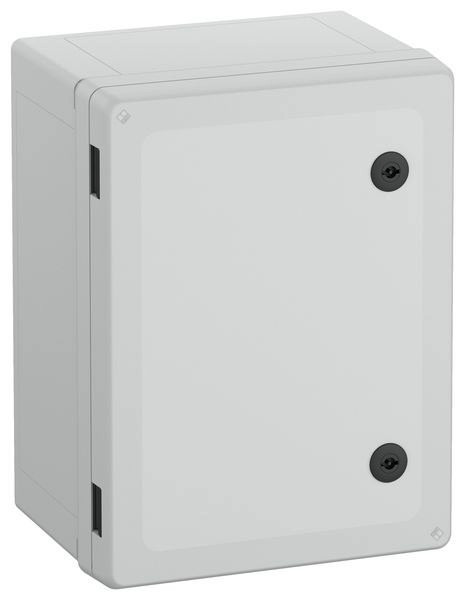 Schaltschrank, geeignet für die Installation in rauen Umgebungen und im ungeschützten Außenbereich, Kasten und Rahmen: glasfaserverstärktes Polycarbonat, grau, ähnlich RAL 7035, Tür: Polycarbonat.