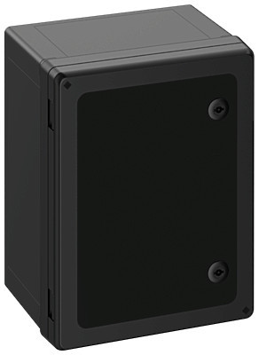 Schaltschrank, geeignet für die Installation in rauen Umgebungen und im ungeschützten Außenbereich, Kasten und Rahmen: glasfaserverstärktes Polycarbonat, schwarz, ähnlich RAL 9005, Tür: Polycarbonat.