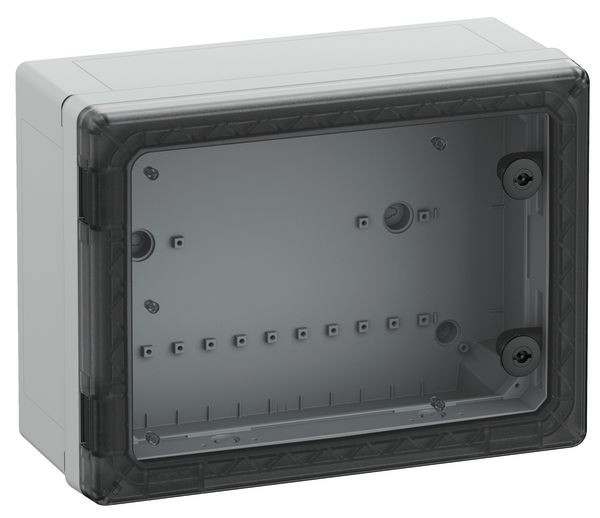Schaltschrank, geeignet für die Installation in rauen Umgebungen und im ungeschützten Außenbereich, Kasten und Rahmen: glasfaserverstärktes Polycarbonat, grau, ähnlich RAL 7035, Tür: Polycarbonat.