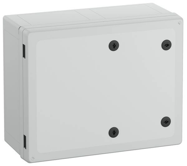 Schaltschrank, geeignet für die Installation in rauen Umgebungen und im ungeschützten Außenbereich, Kasten und Rahmen: glasfaserverstärktes Polycarbonat, grau, ähnlich RAL 7035, Tür: Polycarbonat.