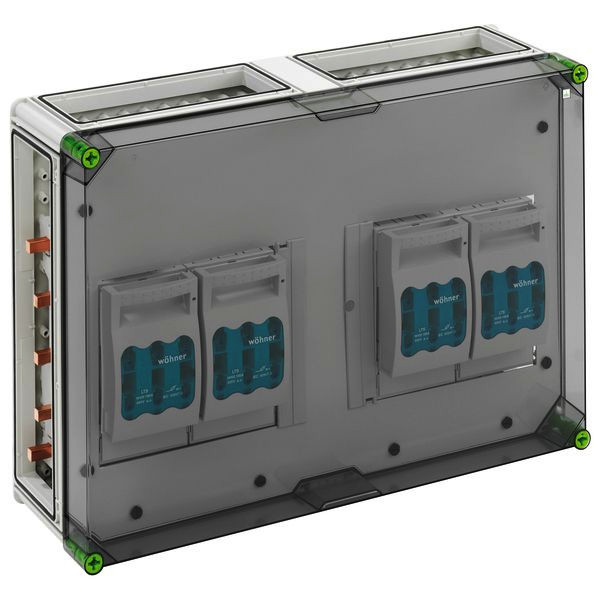 NH-Reiter-Sicherungs-Lasttrennschaltergehäuse mit zusätzlichem Anschlussraum, 4 x NH 00-Reiter-Sicherungs-Lasttrennschalter, Bemessungsstrom 125 A, Schellenanschluss 1,5-70mm², Abgang oben, auf Sammelschiene 5-polig, N-Klemmen 4-35mm², PE-Klemmen 4-35mm², 4 x Gehäuseverbinder (GGV), auf Sammelschienensystem 250 A, mit transparentem Deckel